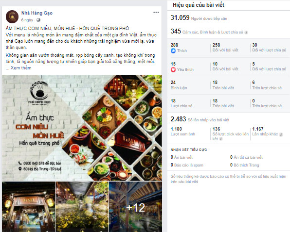 Bài đăng trên Fanpage nhà hàng Gạo đạt rất nhiều lượt xem và tương tác