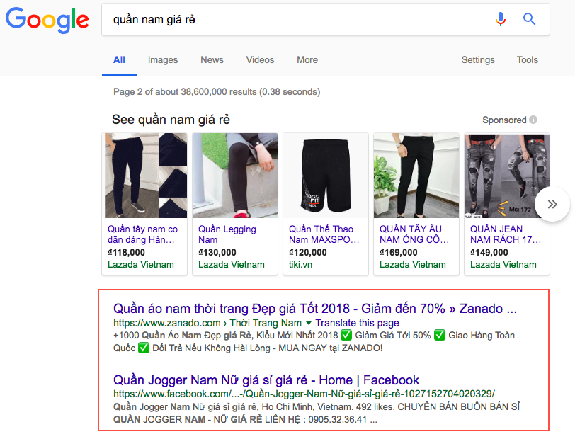 Khi mình lên Google gõ từ khoá “Quần nam giá rẻ” thì lại xuất hiện Fanpage Facebook chứ không phải website.
