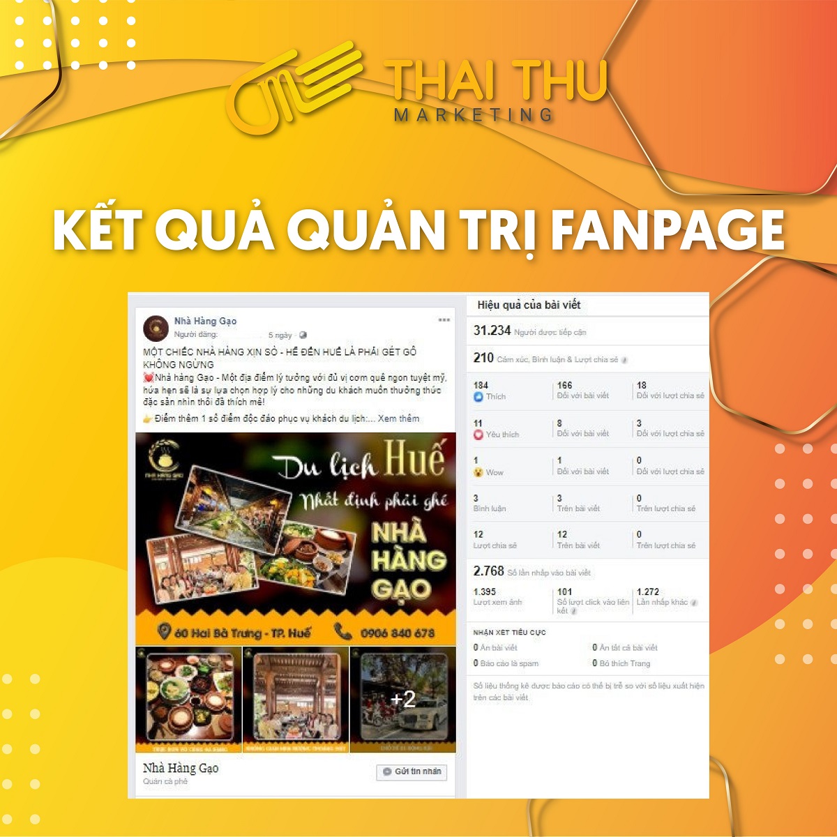 Kết quả quản trị nội dung Fanpage nhà hàng Gạo của Thai Thu Marketing