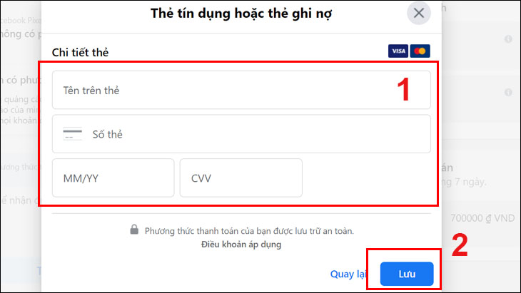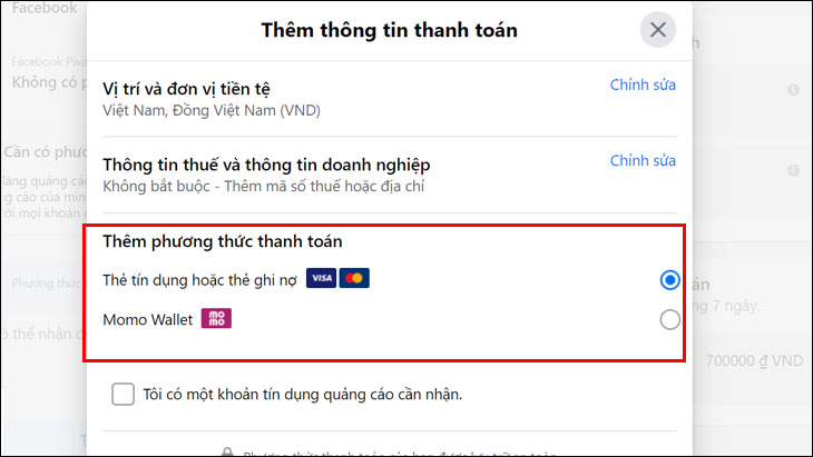 Facebook chấp thuận 2 hình thức thanh toán: Thẻ tín dụng hoặc thẻ ghi nợ; Ví MOMO