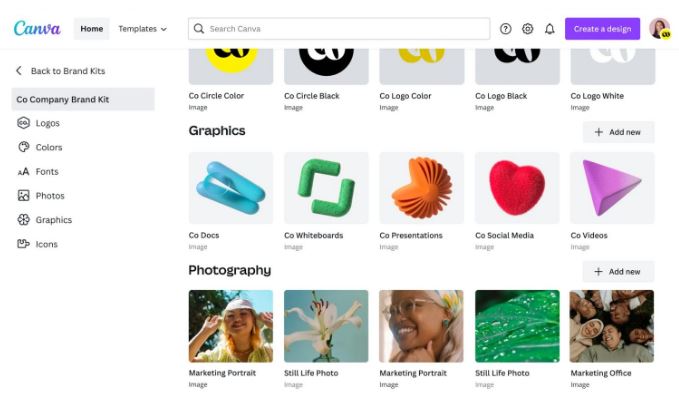 Tính năng phải kể đến đầu tiên là Brand Hub giúp các công ty đồng bộ hình ảnh của thương hiệu. Người dùng có thể tạo ra các bộ Brand Kit bao gồm logo, font chữ, màu sắc và hướng dẫn thiết kế. Các brand folder nhỏ trong từng Brand Kit sẽ giúp lưu trữ các ấn phẩm thiết kế theo từng sự kiện, chiến dịch hoặc dự án. Brand Template cho phép người dùng tạo các mẫu thiết kế có thể tái sử dụng nhiều lần.