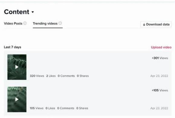 Ngoài ra, bạn có thể dựa vào hiệu quả của video của bạn. Bằng cách chuyển đến Overview, bạn có thể xem số lượt xem, lượt thích, bình luận và lượt chia sẻ để xem nội dung nào nhận được nhiều tương tác nhất. Trong phần Content, bạn có thể theo dõi thời điểm các video phổ biến cũ được phát hành để tối ưu hóa các kế hoạch triển khai nội dung trong tương lai.