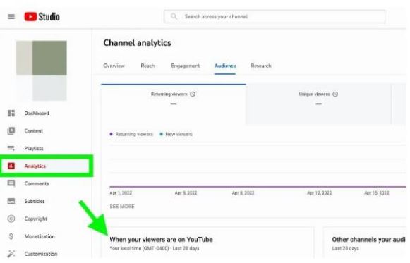 Để xác định thời điểm xuất bản video, bạn cần truy cập vào YouTube Studio và mở phần Analytics ở thanh menu bên trái. Trong phần Audience, hãy chọn When Your Viewers Are on YouTube. Tại đây, YouTube sẽ hiển thị thông tin về ngày giờ người dùng đã hoạt động trong 28 ngày qua.