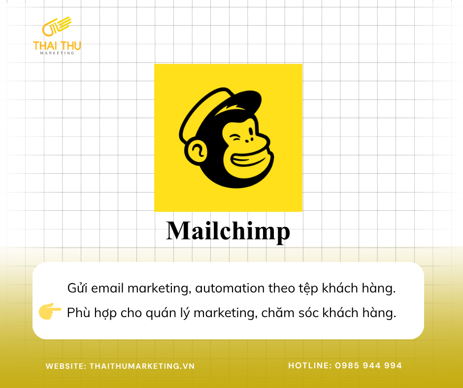 Mailchimp cho phép bạn tạo chiến dịch email ấn tượng, tự động hóa quá trình gửi tin theo từng tệp khách hàng và đo lường hiệu quả dễ dàng.