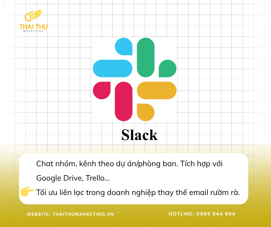 Slack giúp chat nhóm, tạo kênh theo phòng ban hoặc dự án, đồng thời tích hợp với Google Drive, Trello, Zoom…