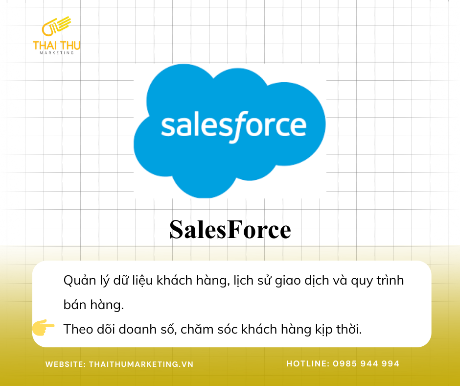 Salesforce là nền tảng quản lý khách hàng hàng đầu thế giới, hỗ trợ lưu trữ dữ liệu, theo dõi lịch sử giao dịch, quy trình bán hàng và chăm sóc khách hàng.