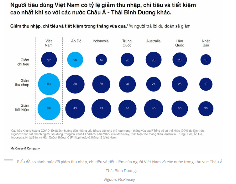 Biểu đồ so sánh mức độ giảm thu nhập, chi tiêu và tiết kiệm của người tiêu dùng trong khu vực Châu Á – Thái Bình Dương.
