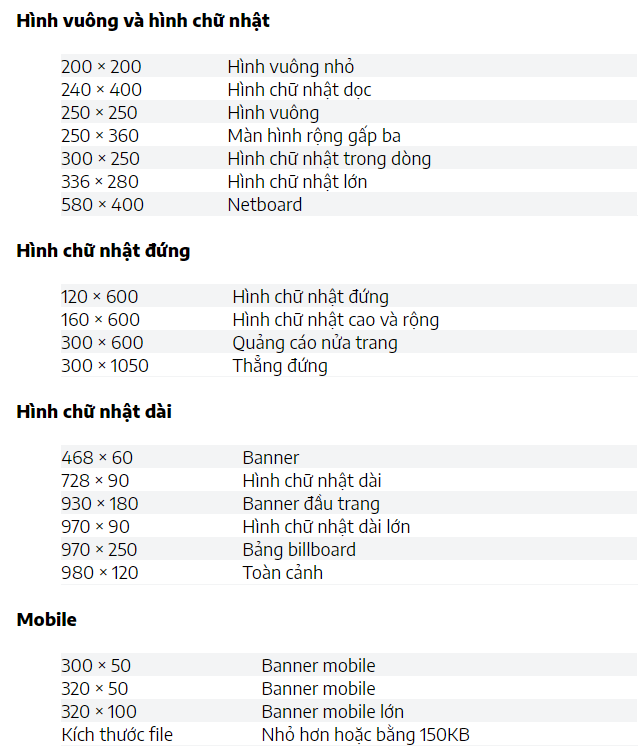 – Bộ phổ biến: size 728 x 90px; size 336 x 280px; size 970 x 90px; size 468 x 60px.