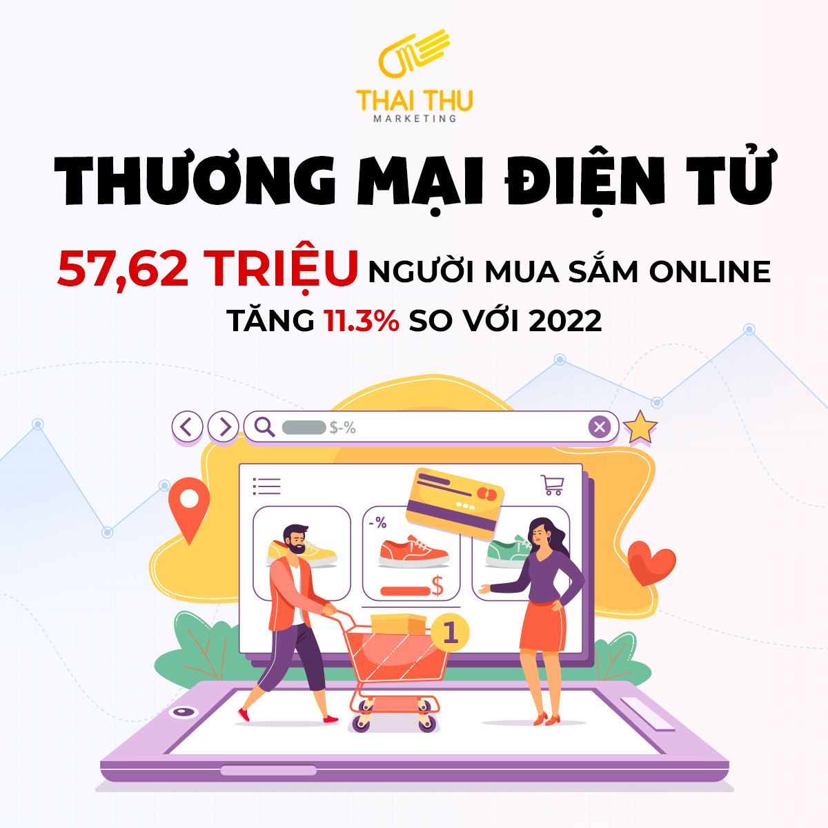 - Trong năm 2023, có tổng cộng 57,62 triệu người đã từng mua sắm online, tăng 11.3% so với năm trước. Tổng giá trị giao dịch online ước tính đạt 12.81 tỉ USD, tăng 0.2% so với 2022 và trung bình mỗi khách hàng chi tiêu 222 USD để mua sắm online, giảm 10% so với năm 2022.