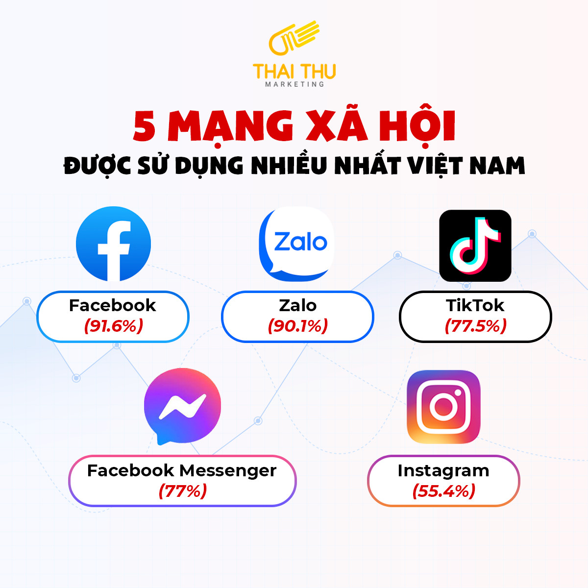 - Trong đó có 5 nền tảng đang được sử dụng nhiều nhất: Facebook (91.6%), Zalo (90.1%), TikTok (77.5%), Facebook Messenger (77%) và Instagram (55.4%).